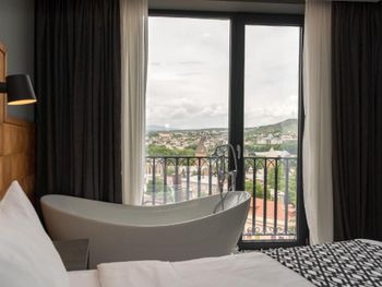 Плюсы: Внимательный персонал, вкуснейшие завтраки, номер чистый и уютный, с потрясающим видом на город. Приятно удивили очень удобные кровати и подушки. Звукоизоляция отличная. Отель был полный, но мы соседей вообще не слышали.