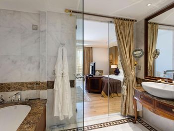 Плюсы: Прекрасный, роскошный отель в восточном стиле, настоящий мрамор и паркет, хрусталь, столовые приборы из мельхиора, мягкие толстые ковры, дорогая сантехника, зеркала и мебель из настоящего ценного дерева! Давно я не видела такого, да, отель старенький, но лучше старый паркет и мрамор, чем новый ламинат и пластик! Все в исправном состоянии, блестит, перед заселением явно была проведена Химчистка ковровых покрытий в номере, это очень важно! И вообще, она проводилась часто и снаружи. В номере полный холодильник всего, вплоть до пачек молока, чего не встретишь ни в каком Ritz-Carlton, хорошая дорогая вода в нормальной большой бутылке, вечером производят подготовку номера ко сну- расправляют кровать, заботливо постилают прикроватный коврик ( чистый) и тапочки. Прелесть 🥰 . Косметика в ванной предоставляется в боксах где есть все, что необходимо, так же, хорошего качества, как и средства для душа. Спасибо 🙏🏻