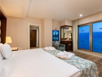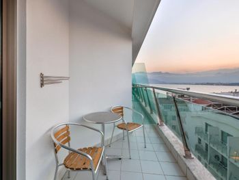 Плюсы: Отличное место расположения, грандиозная архитектура отеля, просторный номер с великолепным видом на море и город, тщательная уборка в номере, пляж на платформе