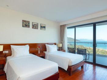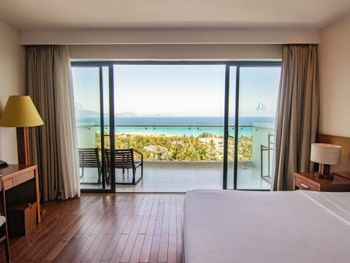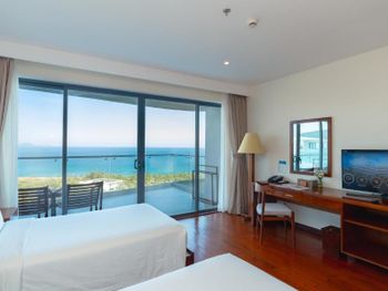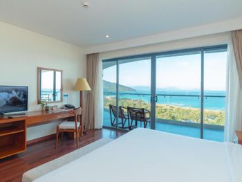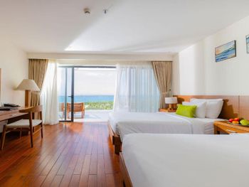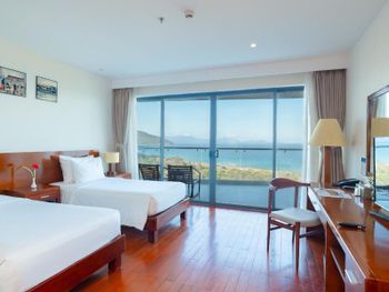Плюсы: Отличный отель для тех кто хочет реально отдохнуть в полном релаксе, позагорать покупаться в теплом море, поиграть в дартс, бочу, полетать с горок в аквапарке, поесть вкусные фрукты, морепродукты. В отличии от турецких отелей утром вы всегда сможете занять свободный лежак под зонтом в первом ряду на пляже (дело в том что вьетнамцы встают рано чтобы встретить рассвет в море, потом завтракают и ложится спать до обеда). Можно набрать пляжных полотенцем сколько захочешь. Можно взять вкусные безалкогольные коктейли в баре у бассейна, арбузы в снек-баре и наслаждаться. Номера в главном здании имеют классный вид на океан. Отель не новый, но недавно отремонтирован и поддерживается в идеальном состоянии. Есть бесплатный автобус до Нячанга, но зарезервировать места в автобусе нужно резервировать заранее, за несколько дней до поездки, лучше резервировать сразу по приезду в отель.