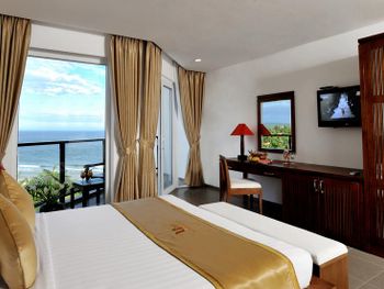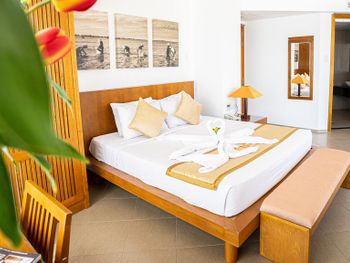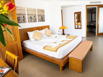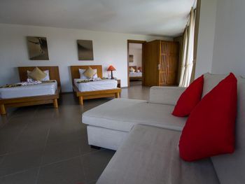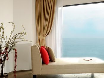 The modern rooms boast sea views and cool breezes through oversized windows and classic wood furnishings. Each room is equipped with a flat-screen satellite TV, tea/coffee maker, and a private bathroom.