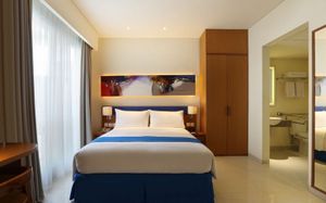 В кондиционируемых номерах (115) отеля Holiday Inn Express Bali Kuta Square предоставляются следующие удобства: док-станция для iPod и сейфы (вмещают портативный компьютер). Постельные принадлежности включают: пружинный ортопедический матрас, а также перьевое стеганое одеяло. Предоставляется выбор подушек. В номерах предоставляется бесплатный высокоскоростной беспроводной доступ в Интернет. В номерах есть 32-дюйм. LED-телевизоры. Предлагаются следующие развлечения: кабельное телевидение премиум-класса. В ванных комнатах есть душ, гидромассажные насадки для душа, фен, тапочки и бесплатные туалетные принадлежности. Во всех номерах есть холодильник, кофеварка/чайник и бесплатная бутилированная вода. Уборка номеров выполняется ежедневно.