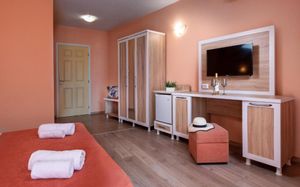 Большой балкон в номере с видом на море, оборудован зонтом, столом и стульями. Очень ухоженная територия отеля, небольшой бассейн с шезлонгами и зонтами. Хорошее соотношение цена-качество.