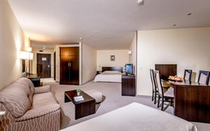 В просторных номерах отеля Bellevue Ski & SPA есть балконы с видом на зеленые окрестности. Во всех номерах есть гостиная зона с диваном-кроватью и телевизором с плоским экраном и спутниковыми каналами, а также ванная комната с ванной и феном.