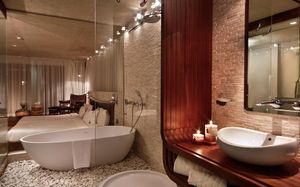 Просторная, современно оформленная ванная комната укомплектована халатами и феном.