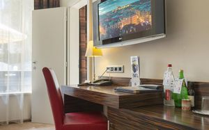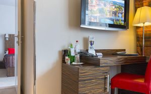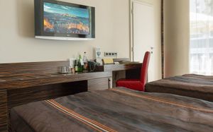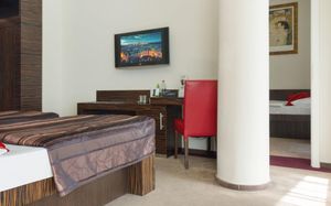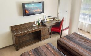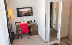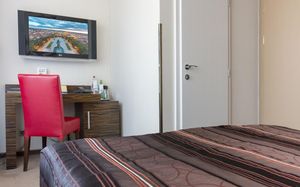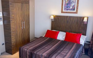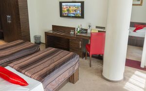 Все номера оснащены кондиционером и телевизором со спутниковым телевидением, а также в числе удобств бесплатный проводной доступ в интернет, сейф и ванная комната с феном.