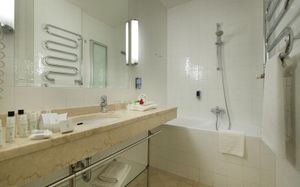 The spacious rooms present a TV, a well-equipped kitchenette, and a bathroom with a bathtub and a hairdryer.