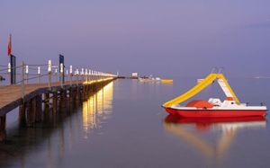 Очень мелкий пляж, чтобы поплавать надо идти по длинному пирсу и там есть квадрат с буйками 10 на 10м, вот и всё. В 18-30 всех гонят с пляжа. Напитки так себе.