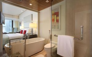 В элегантных номерах с деревянным полом установлены большие окна с красивым видом. Собственная ванная комната отделена стеклянной панелью с электронными жалюзи. В числе прочих удобств ЖК-телевизор, принадлежности для чая/кофе и док-станция для iPod.