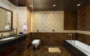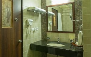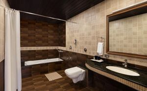 В душе бесит смеситель. Могли бы поставить и удобный, а не этот с 3 крутилками. Душевая лейка - это самоделка. Но речь об отдельном коттедже. Возможно, в комнатах в корпусе душ оборудован по-другому.