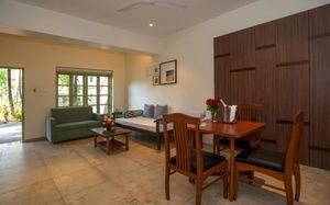 Завтрак супер. Если бронируйте апартаменты, то обратите внимание, что они находятся в удалении от моря и основой территории. У нас была арендованная машина, поэтому проблемы не было. На самом деле апартаменты находятся в живописном месте, окна выходят на джунгли, где вы можете увидеть множество птиц, в том числе знаменитого в ГОА зимородка (kingfisher). Если прогуливаться пешком от апартаментов до отеля, то это займет у вас 10-15 минут, по дороге вы также можете знакомиться с природой - луга, где пасутся коровы, вокруг которых крутятся цапли, хлебное дерево, дерево с помело, папайю и т.д. Сами апартаменты чистые, убирались каждый день. По запросу вы можете решить свою проблему. Пляж Бетальбатим очень чистый и красивый, мы первый раз в жизни видели морскую звезду, часто по пляжу проходят зебу. На пляже вблизи отеля несколько шэков, которые предложат вам вкусную еду и напитки по умеренным ценам.