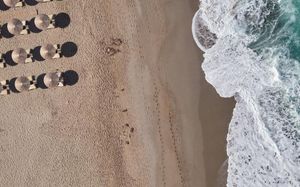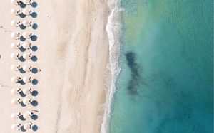 Территория пляжа: песок, песчаный пляж, полотенца, шезлонги, зонтики