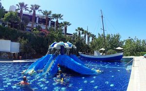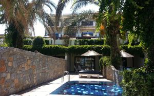 Изучив большое количество неоднозначных отзывов, несколько волновались перед отпуском. Но все оказалось зря, поскольку отдых в этом отеле нам очень понравился. На ресепшене нам сделали неожиданный сюрприз и бесплатно повысили категорию номера. Вилла была потрясающей. Везде очень чисто, бассейны ухоженные, территория большая, красивая(как на фото в Инстаграме). Море кристально чистое, теплое. Кстати, полотенца никто не ограничивал, их было достаточно и не нужно было о них беспокоиться)). Мелочь, но это приятный сервис. Персонал был дружелюбным, отзывчивым. На баре был оригинальный алкоголь хорошего качества, до 11 ч ночи коктейли бесплатные и безлимитные. Единственное, что хотелось бы заметить, что просто необходимо расширить и пересмотреть меню на обед. Завтрак был хорошим, стандартным, всего было вполне достаточно. Ужин тоже вкусный, разнообразный. В общем ресторане никогда не было блюд из морепродуктов, только салат из ракушек)). Отель находится удалённо от аэропорта, такси для 3 человек стоило 50 евро, но зато это очень быстро и удобно. Ещё нужен был депозит в размере 200 евро, его вернули без проблем при выезде. И городской сбор, как и везде, в размере 5 евро в сутки с человека тоже нужно учитывать. И ещё, нам разрешили взять с собой выпечку и снеки на завтрак, потому что у нас был ранний вылет. Спасибо за отдых!