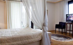 The classic rooms at Kymata have private furnished balconies with views of the sea. Each has a modern bathroom with hairdryer. Suites with hot tubs are available.