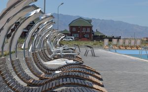 Тенистые аллеи, скверы, фонтаны, ночное освещение по территории. Дорога от берега до пляжа также асфальтирована и освещена.