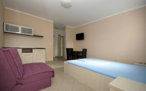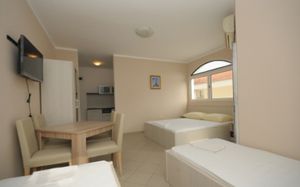 Studio 03+1: около 35м2 +терраса 5м2, французская кровать и раскладной диван (либо две отдельных кровати), мини-кухня, душевая кабина.