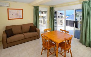 The apartments have 1 or 2 bedrooms and a bathroom. The living space includes a satellite TV, sofa bed, and dining table. The kitchenette is equipped with a hob, microwave, and fridge. Bed linen and towels are provided.
