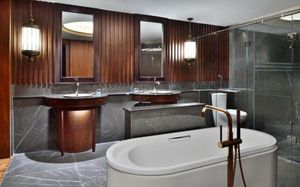 Туалетная бумага Полотенца Биде Дополнительный туалет Ванна или душ Тапочки Собственная ванная комната Бесплатные туалетно-косметические принадлежности Халат Фен Ванна Душ