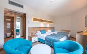 Featuring modern architecture and stylish details, all rooms are designed with contemporary furnishings and a bright, spacious atmosphere. Guests can enjoy breathtaking Mediterranean views from their private balconies, while amenities such as air conditioning, flat-screen TV, free Wi-Fi, and minibar ensure maximum comfort. The private bathrooms are equipped with high-quality luxury toiletries, adding an extra touch of exclusivity to your stay.