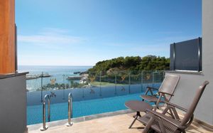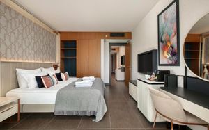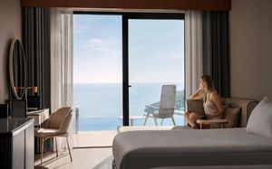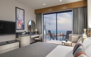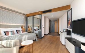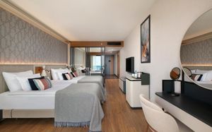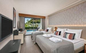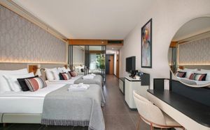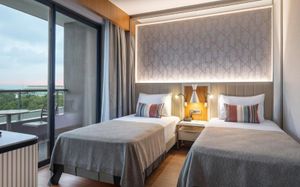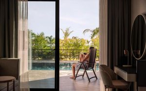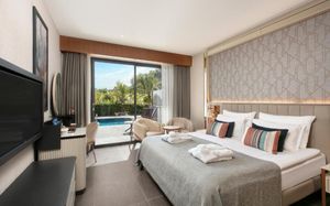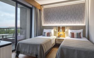 Отдыхали в отеле 5 ночей с 10-15 октября 2025г. В день заезда у меня был день рождения, меня ждали в номере бутылка шампанского и тарелка с вкусняшками, на кровати были лебеди, муж и сын заказали для меня в номер букет роз с запиской. Отель влюбляет в себя с первого взгляда и впечатления не портятся до конца пребывания, все очень чисто, ухожено, персонал заслуживает отдельной похвалы, все очень милые, клиентоориентированы, это был отличный отдых! У нас был номер на 1 этаже с бассейном - это кайф, конечно). Отель отличный 👍 алкоголь качественный европейский , к еде тоже вопросов нет, все есть, вкусно и каждый найдет для себя то что ему хочется) Не минусы, а скорее пожелание: у дверей на мостики на 1 этаже не плохо было бы сделать плавные доводчики, двери громко хлопают с 7 утра до позднего вечера, у нас ребенок взрослый, но если у кого ляльки, грохот дверей может разбудить Индивидуальные бассейны на балконах можно начинать подогревать с 1 октября, оочень бодрящие, мы поплавали, конечно, но если б водичка была потеплее, проводили бы в нем гораздо больше времени) Спасибо за наш прекрасный отдых, вы в моем сердечке, вы лучшие ❤️❤️❤️❤️❤️