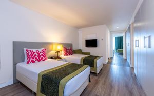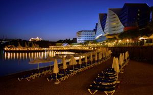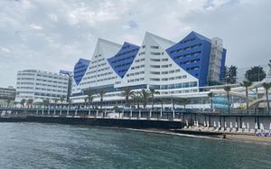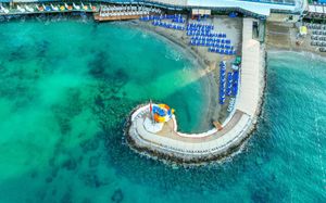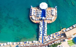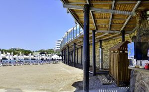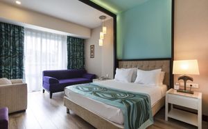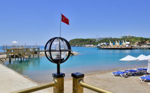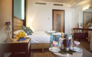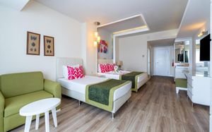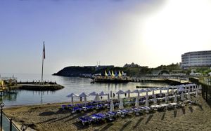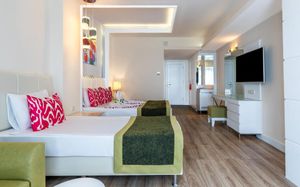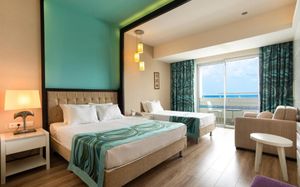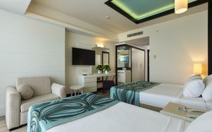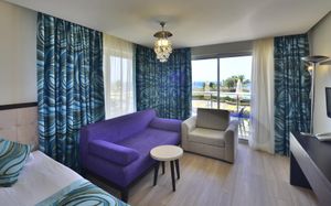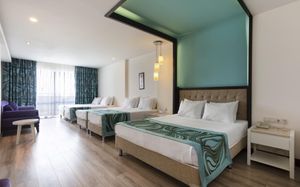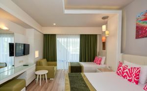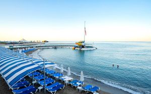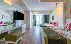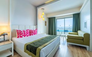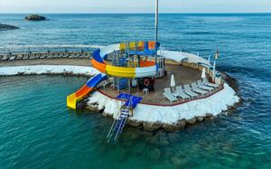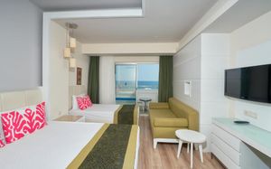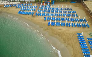 It has an outdoor pool with water slides, its own 1000 m² beach area, panoramic sun terrace and spa facilities. It offers air-conditioned rooms with a satellite TV and balcony.