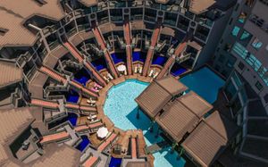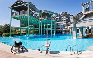 Размещение с животными: В отеле созданы все условия для комфортного пребывания людей с ограниченными возможностями: специально оборудованные номера, пандусы, лифт в бассейне (летом в открытом бассейне, зимой в крытом), удобный въезд на пляж, специальные кресла для передвижения по пляжу, прокат кресел-колясок (10 евро/день, по предварительному запросу).
