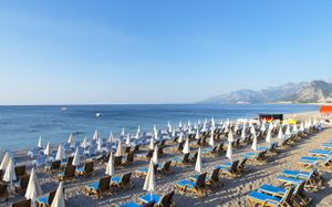Между отелем и пляжем есть автомобильная дорога, есть подземный переход Пляж обслуживается и оборудован с 1/05 по 15/10