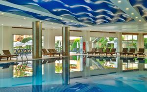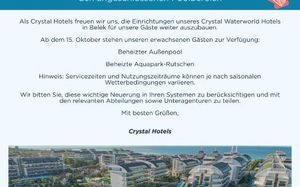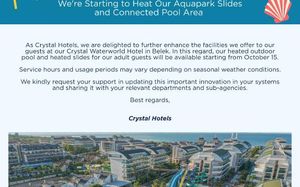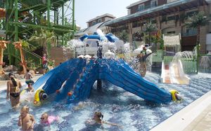 4 открытых бассейна с пресной водой (без подогрева) 1 крытый бассейн с пресной водой (подогрев с 1/11 по 31/03) 11 водных горок, без подогрева, часы работы 10:00-12:00 /14:00-17:00 С 15.10.2025 года 1 открытый бассейн и горки для взрослых гостей работают с подогревом Часы работы и периоды могут варьироваться в зависимости от погодных условий
