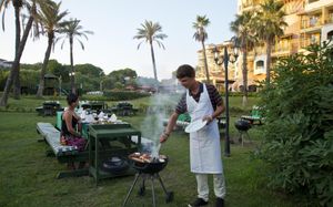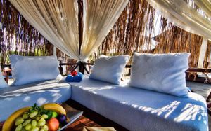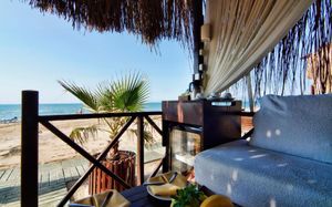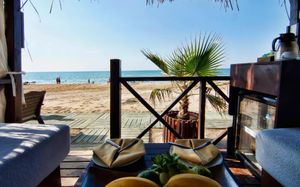 На пляже - специальное кресло-шезлонг на колесах большого диаметра для удобного передвижения по песчаному пляжу.