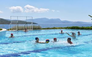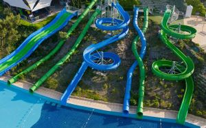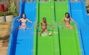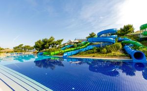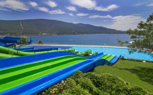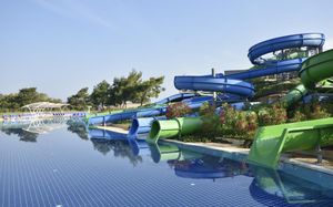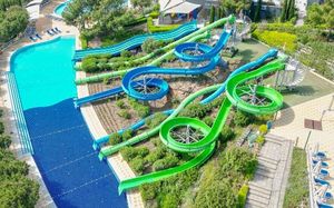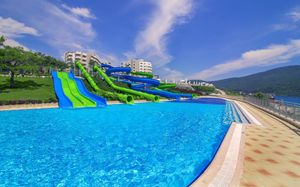 3 открытых бассейна с пресной водой (1 из них с подогревом в апреле, мае и октябре) 1 крытый бассейн с пресной водой (c подогревом) 10 водных горок горок, без подогрева, часы работы 10:00-12:30 / 14:30 -17:00