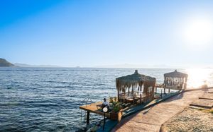 Павильоны на пляже и пирсе платно (стоимость уточняется на месте)