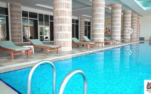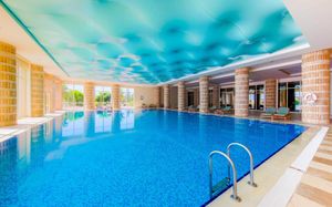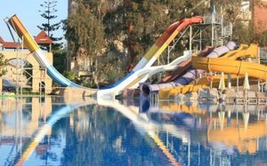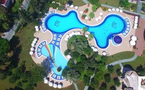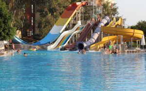 4 открытых бассейна (без подогрева), площадь 1224 кв.м, 840 кв.м, 210 кв.м, 200 кв.м 2 крытых бассейна (подогрев в зимний сезон) Аквапарк (6 водных горок), часы работы 10:00-12:00 и 14:00-16:00 Водные горки работают в зависимости от погодных условий