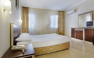 Добрый день. Отдыхали в отеле с 29.05.16 по 10.06.16 г. (13 дней, 12 ночей) с женой и 10 месячным ребенком. Буду краток. Стоимость путевки: Составила 286 000 тг/ на 2х = 850$ +50$-топливный сбор за ребенка (без предоставления места). Летели из Астаны 4,5 часа. Путевку брали в HT.KZ (Хот тур кз). . Вайфай только на ресепшен. Не понимаю людей которые все время не вылезали с ресепшена и торчали в интернете. Сейф платный -2$/сутки, но мы не пользовались деньги хранили в чемодане, краж не было. Территория отеля: Территория на 5-ку, большая зеленая, много тени, густые сосны, соответственно воздух чистейший, тихо и красиво. Везде есть пандусы что хорошо для детских колясок и инвалидов. Номер: Номер на 4-ку. Мы прилетели в 10 утра, а заселяют не раньше 14:00, но заселили нас сразу же (без никаких доплат). Огромное спасибо администратору парню турку, он хорошо говорит по русски (к сожалению в Сиде мало русскоговорящих турков в отличии от Кемера). Мы приятно удивились когда получили СЕМЕЙНЫЙ номер (2 комнаты) с большой кроватью вместо стандартного (Наверное потому что Турки очень любят малышей). Номер 5108, рядом с бассейном, чистый, аккуратный, уборка каждый день, в номере прохладно, даже кондер не включали ни разу. Единственный минус пол кафельный холодный и нет ковров. Маленький ребенок был постоянно на руках, ползать не мог. Телевизор малюсенький, есть 2 канала на русском. Ресторан и еда: Ресторан на 4-ку. Еды много но, мяса нет. Только курица и рыба. Говядина была 1 раз за 12 дней, 1 раз кебаб на гриле, 1 раз индейка. Молоко только по утрам. Так что любителям чая с молоком не повезло. Я делал себе фреш: 4 апельсина, выжимал половинку руками в стакан и НАСЛАЖДАЛСЯ. На пляже есть бар где с 11-ти утра и до 17:00 готовят турецкие лепешки и пицу. Пица - прелесть. Это очень удобно. Море и пляж: Пляж хороший, просторный,песок, шезлонгов свободных много и в любое время (из за отсутствия Россиян). Море теплое, вход пологий, надо метров 30 пройти чтоб 1,6 метра глубины дойти. Это очень хорошо для детей. Камней почти нет, но пару раз я натыкался на одинокие камни. Есть пирс. Минусы: при входе в море слева течет ручеек с непонятной водичкой. Так что если будете купаться берите правее. Деревянная дорожка и ступени на пляже - ужасная. Последняя ступень играет. При нас в первый же тень женщина упала и разбила себе колено и локоть. На брусья надо наступать только посередине, так как они не прибиты и могут ударить при наступлении на край. Анимация: Анимация на 4-ку с минусом. Без обид ребята, но я был в 5-ках и есть с чем сравнить. Единственное оправдание что наш отель "немецких пенсионеров" был на 70 % из пожилых людей, ведущих ПАССИВНЫЙ отдых. В 22:00 -тишина, никакой музыки. Зато на дискотеку всегда пожалуйста- 10$. На самом деле вход на дискотеку бесплатный, только внутри алкоголь ДОРОГОЙ. ПИВО 0,5= 20 лир.=7$. В основном все дискотеки в старом Сидэ. Туда можно самим скооперироваться 3-4 чел и доехать на такси намного дешевле чем 10$ с человека. А перед дискотекой накидаться вы можете у себя на баре до 22:00. Бары и Алкоголь: Бар у бассейна (пиво, водка, раки, джин и прочее, Бар на пляже с 10:00 до 17:00 нравится тем что краник с пивом и пепси повернуты к посетителям и можно самим наливать не дожидаясь барменов. Но на пляже нет крепкого алкоголя. Вечером перед закрытием бара до 22:00 мы брали из номера в минибаре 1.5л баклашку из под воды и наливали в нее пиво. Ну надо же бы