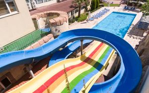 2 открытых бассейна без подогрева, площадь 750 и 119 кв.м 1 крытый бассейн (подогрев 15.04-15.05 / 15.10-07.11, площадь 136 кв.м 2 водные горки для взрослых и 1 для детей, работают с 10:00-12:00 и с 14:00-17:00