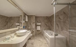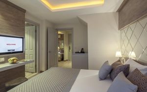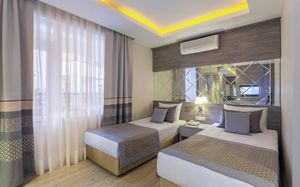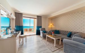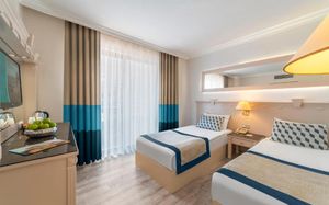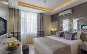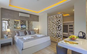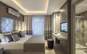 Шикарные номера отеля Hotel Turan Prince - All Inclusive стильно и современно оформлены в теплых тонах. Во всех номерах есть телевизор со спутниковыми каналами и мини-бар. В некоторых из них обустроен гостиный уголок. В отделанной мрамором ванной комнате с ванной предоставляются бесплатные туалетно-косметические принадлежности, фен и тапочки.