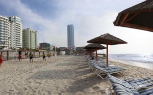 Между отелем и пляжем есть автомобильная дорога В отеле есть временный полностью оборудованный частный пляж, расположенный в 1 км от отеля (10 минут пешком и 2–3 минуты на автобусе, отправляющемся каждые 30 минут)