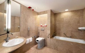 Шнур/кнопка вызова помощи в ванной Низкая раковина Высокий туалет Туалет с поручнями Подходит для гостей в инвалидных креслах Полностью подходит для гостей с ограниченными физическими возможностями Лифт для доступа к верхним этажам