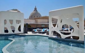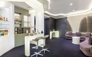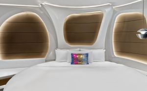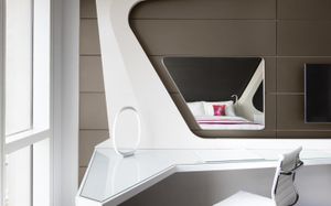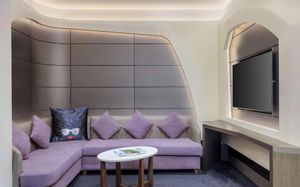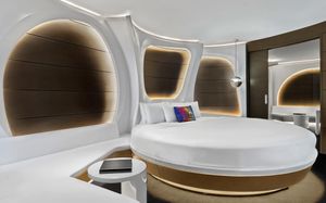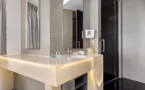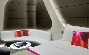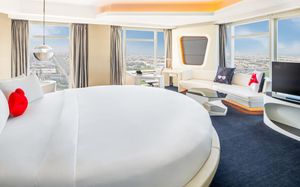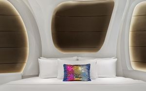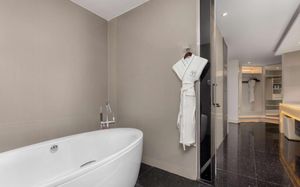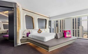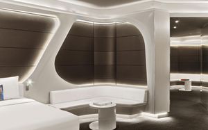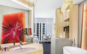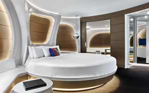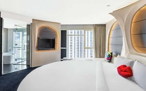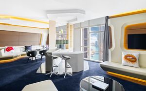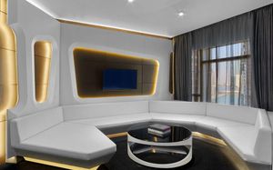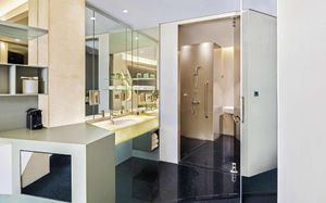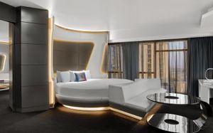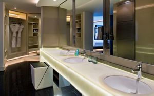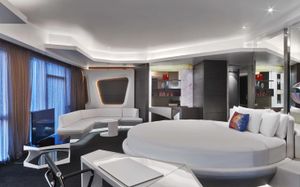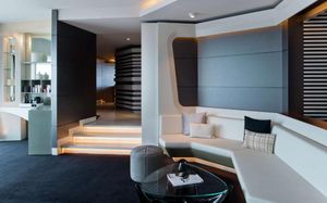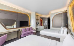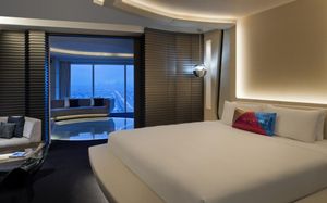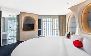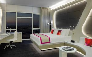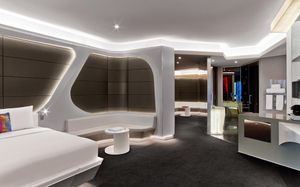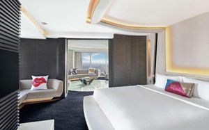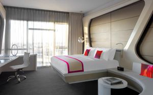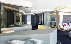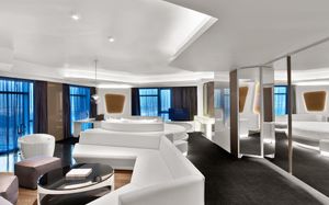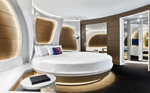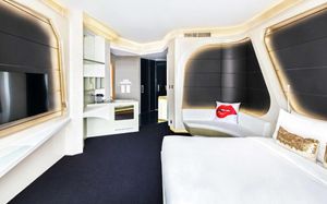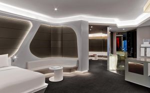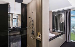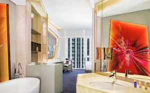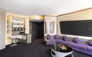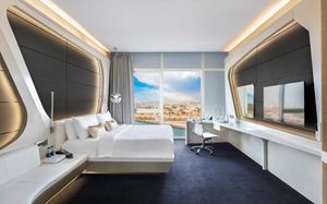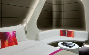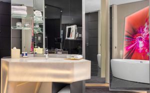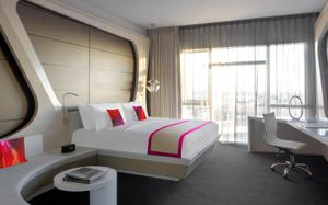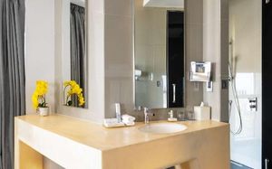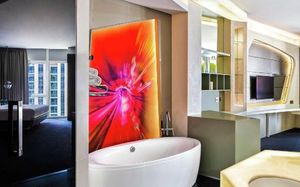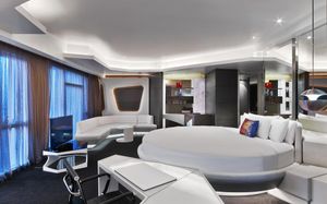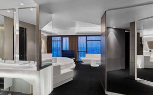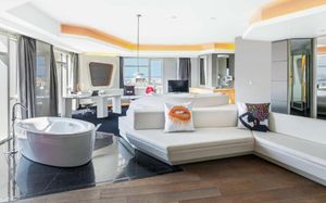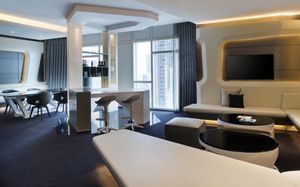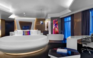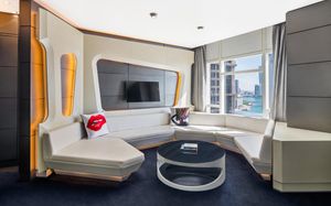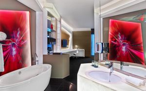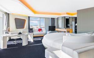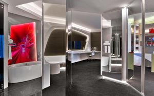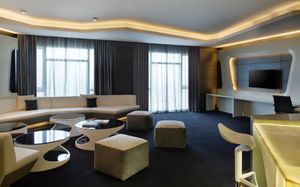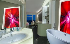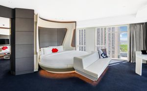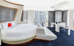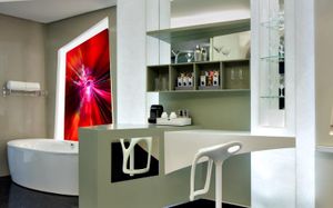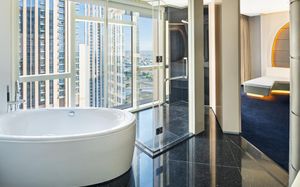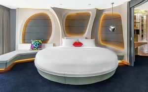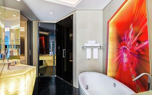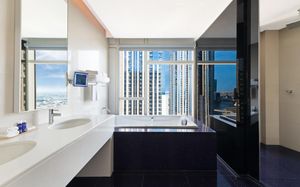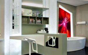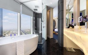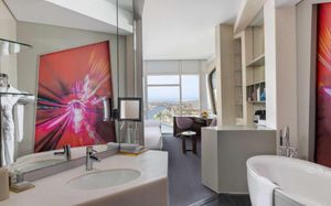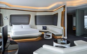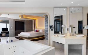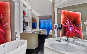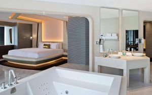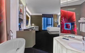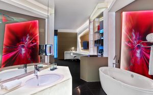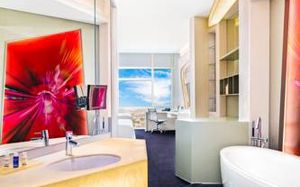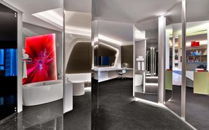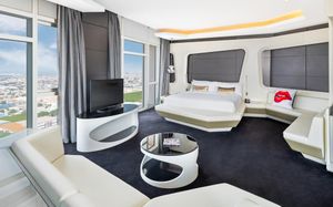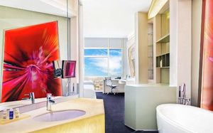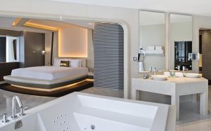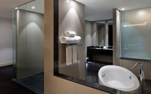 The rooms are spacious with futuristic style, seating areas and satellite flat screen TVs. The bathrooms are like nothing you've seen with the bathtub set in an open plan fashion.