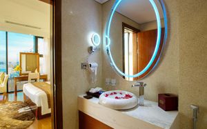 The hotel boasts two outdoor swimming pools that provide breathtaking panoramic views of the sea, creating a serene atmosphere for unwinding and soaking up the beauty of the surroundings.