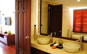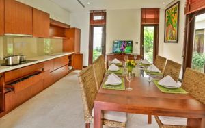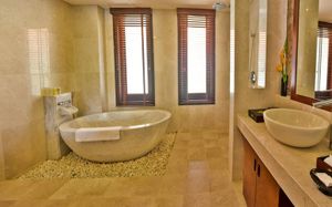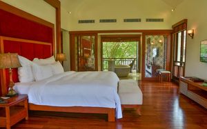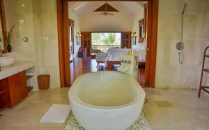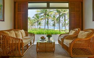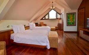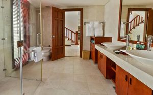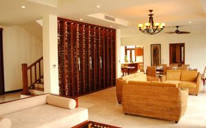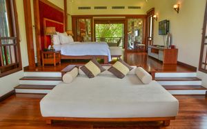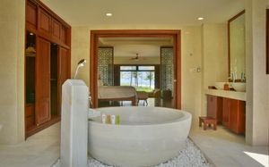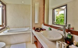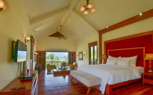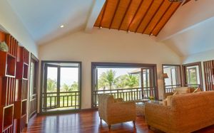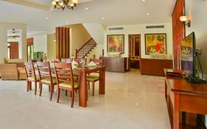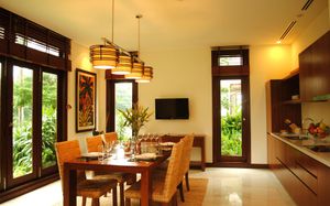 Offering pool or ocean views, each double-storey villa comes with living and dining areas. A well-equipped kitchen includes a stove, minibar and microwave.