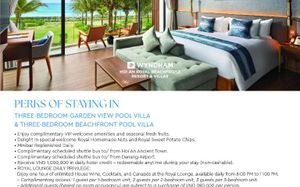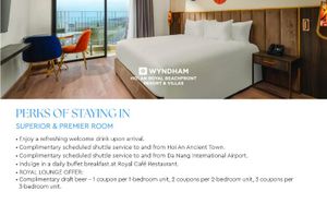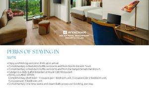 Wyndham Hoi An Royal Beachfront Resort & Villas — это курортный отель в городе Хойан, в 10 м от такой достопримечательности, как Пляж Ха Май. Среди удобств — бесплатные велосипеды, открытый бассейн, фитнес-центр и бесплатная частная парковка. Кроме того, к услугам гостей сад и частный пляж, а также терраса. Гости могут обратиться к сотрудникам круглосуточной стойки регистрации, воспользоваться трансфером или детским клубом, а также подключиться к бесплатному Wi-Fi. В Wyndham Hoi An Royal Beachfront Resort & Villas во всех номерах имеется кондиционер, телевизор с плоским экраном с кабельными каналами и сейф. Среди прочих удобств — гостиная зона и собственная ванная комната с душем, бесплатными туалетно-косметическими принадлежностями и феном. В собственной ванной комнате есть тапочки. Гостям Wyndham Hoi An Royal Beachfront Resort & Villas предоставляются постельное белье и полотенца. Гостям предлагается завтрак «шведский стол», континентальный завтрак или американский завтрак. При Wyndham Hoi An Royal Beachfront Resort & Villas работает ресторан, где подают блюда вьетнамской кухни, блюда местной кухни и блюда азиатской кухни. Гости могут попросить приготовить вегетарианские, халяльные и веганские блюда. К услугам гостей Wyndham Hoi An Royal Beachfront Resort & Villas — детская игровая площадка. На территории Wyndham Hoi An Royal Beachfront Resort & Villas можно поиграть в бильярд. К услугам гостей аренда автомобилей. Wyndham Hoi An Royal Beachfront Resort & Villas располагается на расстоянии 7,2 км и 7,3 км соответственно от таких достопримечательностей, как Музей Хойана и Японский крытый мост. Международный аэропорт Дананг находится в 21 км.