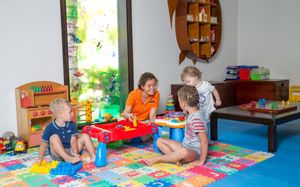 Детская кровать, детские стульчики в ресторане, игровая площадка, бассейн, ...