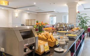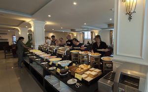 Очень классные завтраки, номер сам достаточно большой, есть вид из окна на город, есть горячая вода.
