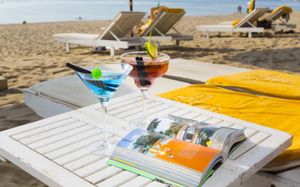 Песчаный пляж, полотенца, зонтики