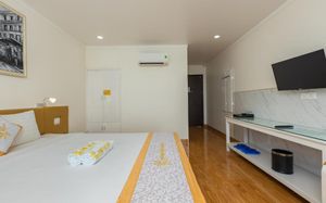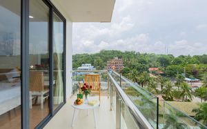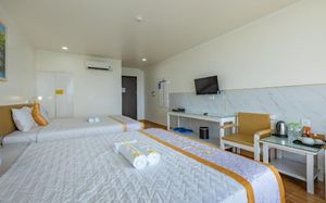 Отель находится прямо возле остановки 17 автобуса, который идёт по направлению в аэропорт. На нём же удобно добраться до аэропорта и это бесплатно. До пляжа около 4 минут пешком через бар. Есть указатели. У отеля нет своих лежаков на пляже. На первом этаже есть спортзал. А на крыше бассейн с видом на Сиамский залив и на то как садятся самолёты. Очень близко к аэропорту и довольно хорошо видно. Это потрясающее! Ради этого и стоит здесь жить. Номер очень просторный и комфортный. Есть 2 бутылки воды бесплатно, сейф и капучино. Завтрак очень обильный. Очень большой выбор еды. Есть даже борщ. Это очень удобно. Но, помните, при выселении проверяют номер и придётся ждать около 10 мин. Учитывайте это, особенно, если едете в аэропорт. Рекомендую